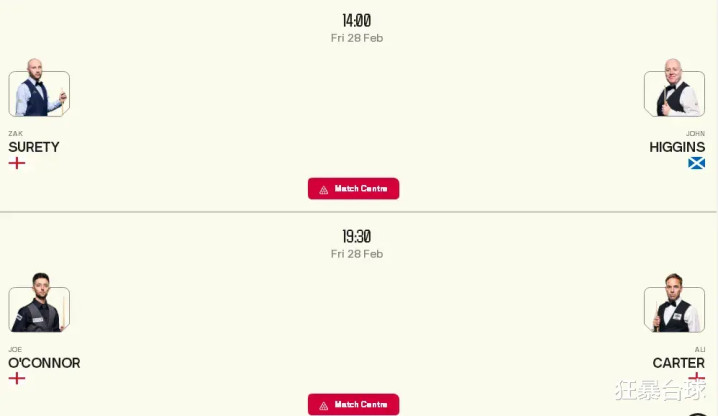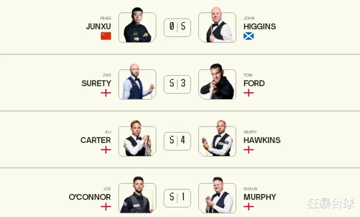 看一下半决赛的赛程安排,下午两点苏尔蒂对阵希金斯,晚上7点半奥康纳对阵卡特,四强阵容中希金斯和卡特两位70后,奥康纳和苏尔蒂两位90后,除了希金斯是苏格兰人,剩下的三位都是英格兰人。苏尔蒂是第一次打进半决赛,奥康纳此前也只进过一次决赛。