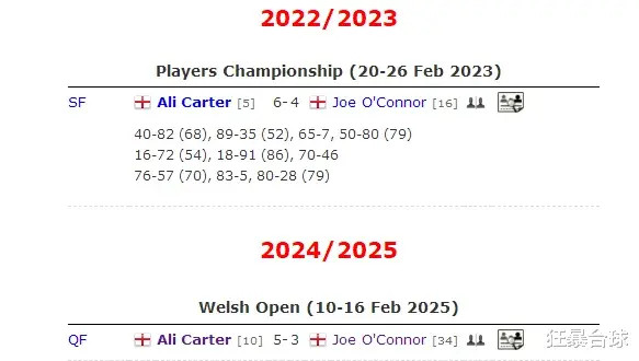 卡特奥康纳双方过往交手两次,卡特全胜,本赛季的威尔士公开赛8进4,卡特5-3赢了奥康纳,今天的半决赛是抢6,2023年的球员锦标赛半决赛,卡特6-4赢了奥康纳。